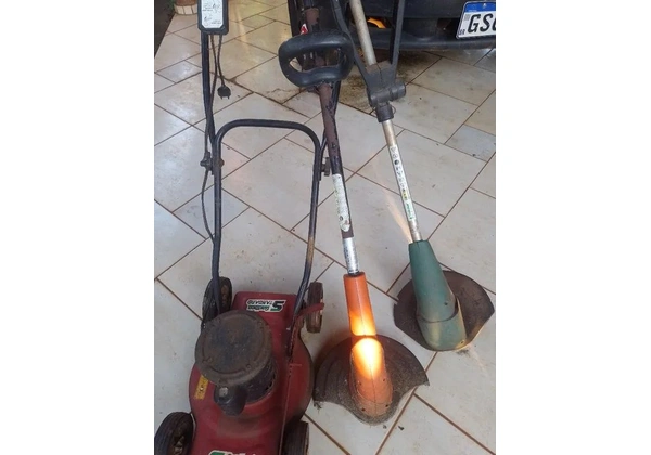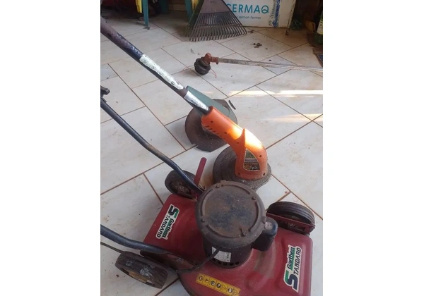 2 máquinas de mão e um carrinho de cortar grama, com extensão.