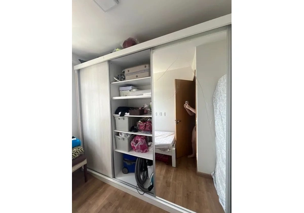 Armário de correr com espelho, ideal para organizar seu quarto com estilo. Possui amplo espaço interno, prateleiras e gavetas para acomodar suas roupas e objetos com praticidade. O acabamento em branco deixa o ambiente clean e moderno.