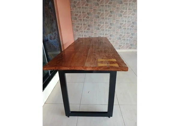 Mesa de madeira maciça com pés de ferro, perfeita para sua sala de jantar ou cozinha. A madeira é de alta qualidade e o acabamento é impecável. Os pés de ferro dão um toque moderno à mesa. Mesa em excelente estado de conservação.