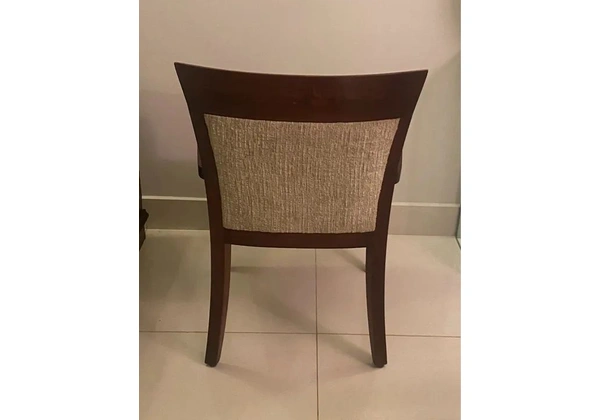 Mesa usada quadrada de 1, 30m x 1, 30m de mármore Aurora Veiado com frisos em granito preto, design diferenciado, com pé em cubo do mesmo material e conjunto de 06 cadeiras da Artefacto, em madeira maciça de lei, com estofamento em tecido.
