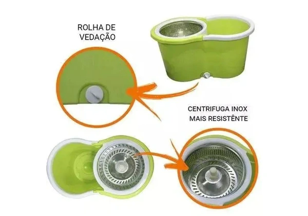 Sistema de escoamento de água. O balde spin mop com centrifuga inox é ideal para pisos frios, sintéticos, madeira e outros, o ele é perfeito para a limpeza geral, pois é eficiente e durável. Possui um cabo com trava a rosca em aço inox com base flexível permitindo alcançar áreas de difícil acesso. O balde mop vai substituir a vassoura, o rodo e o pano de chão na hora da limpeza. Toda a limpeza é cansativa em diversas proporções, este produto chegou para facilitar a limpeza em sua residência, empresa entre outros. Com seu grande poder de absorção graças a seu refil em poliéster* que absorve agua e sujeira muito mais rápido e com muito mais facilidade, o balde mop pode ser usado em qualquer lugar, em portas, janelas, móveis, escadas e até na lavagem do seu carro sem se preocupar com riscos ou manchas. Suas cerdas macias de poliéster de super-absorção não agridem o piso, não riscam o seu porcelanato e se moldam facilmente nos cantos mais difíceis ou em baixo dos móveis.