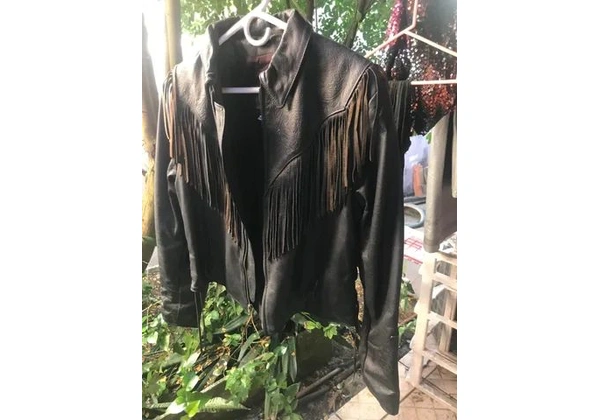 Jaqueta nunca foi usada. desenhada na frente e atrás feito na pressão. Estilo Harley Davidson. Feita de couro verdadeiro. Tamanho médio/grande