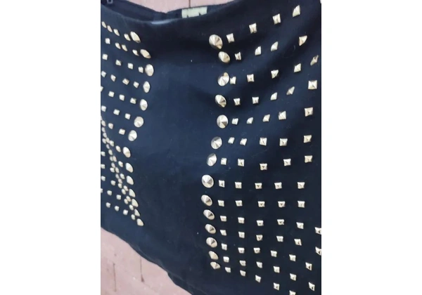 Saia preta de tecido leve com tachas douradas. Saia forrada perfeita para um look moderno e cheio de estilo!